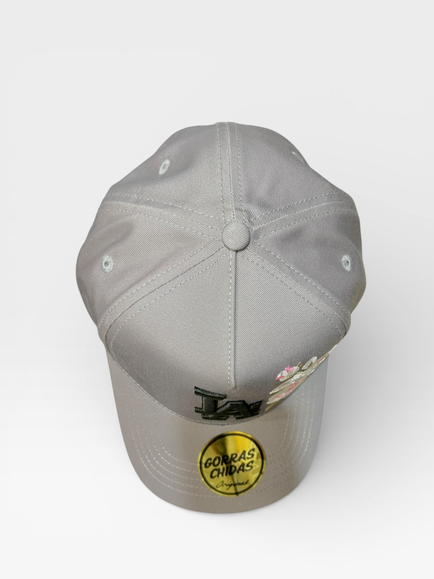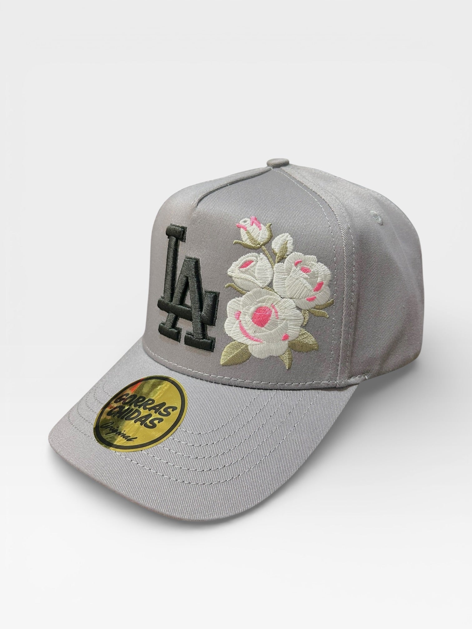 Gorra “LA” en color grís con bordado de rosas blancas. Talla Ajustable.