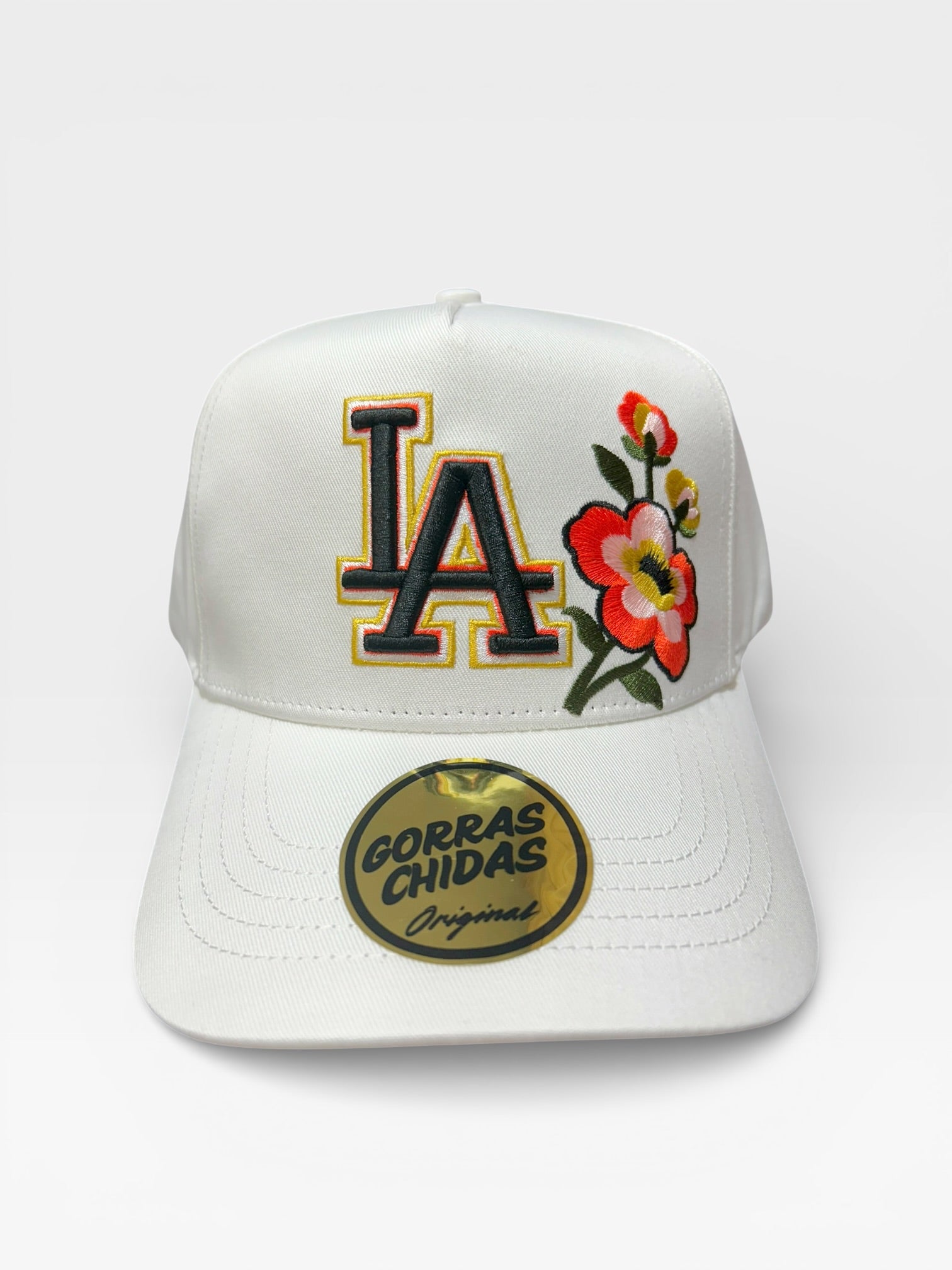 Gorra “LA” en color crema con bordado de flores rojas. Talla Ajustable.